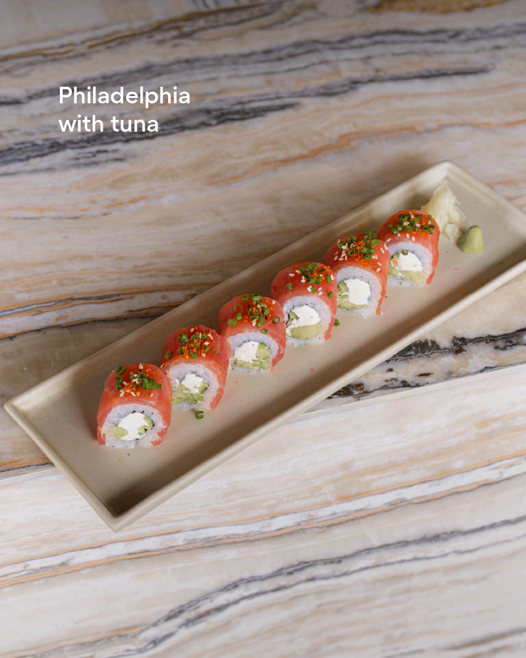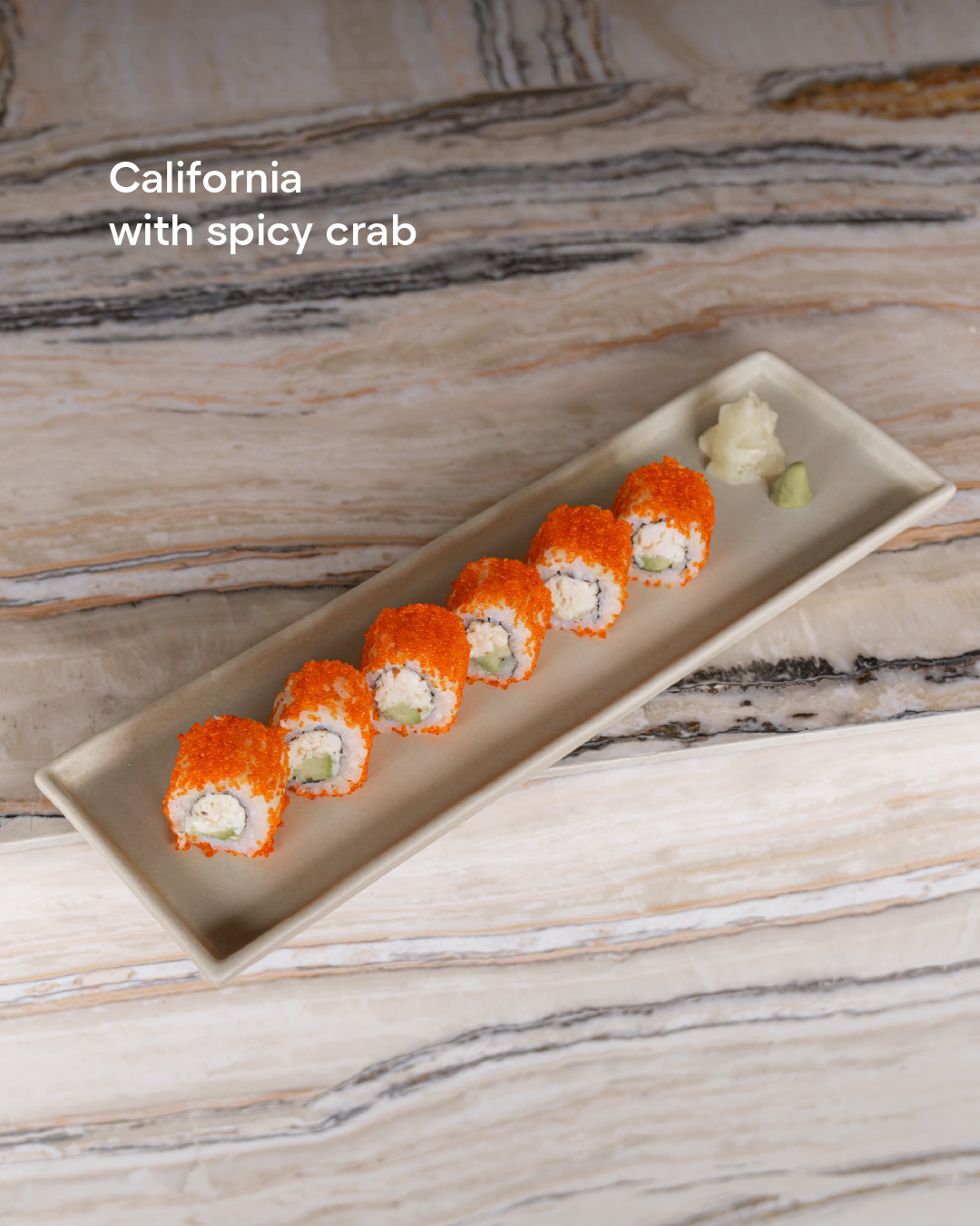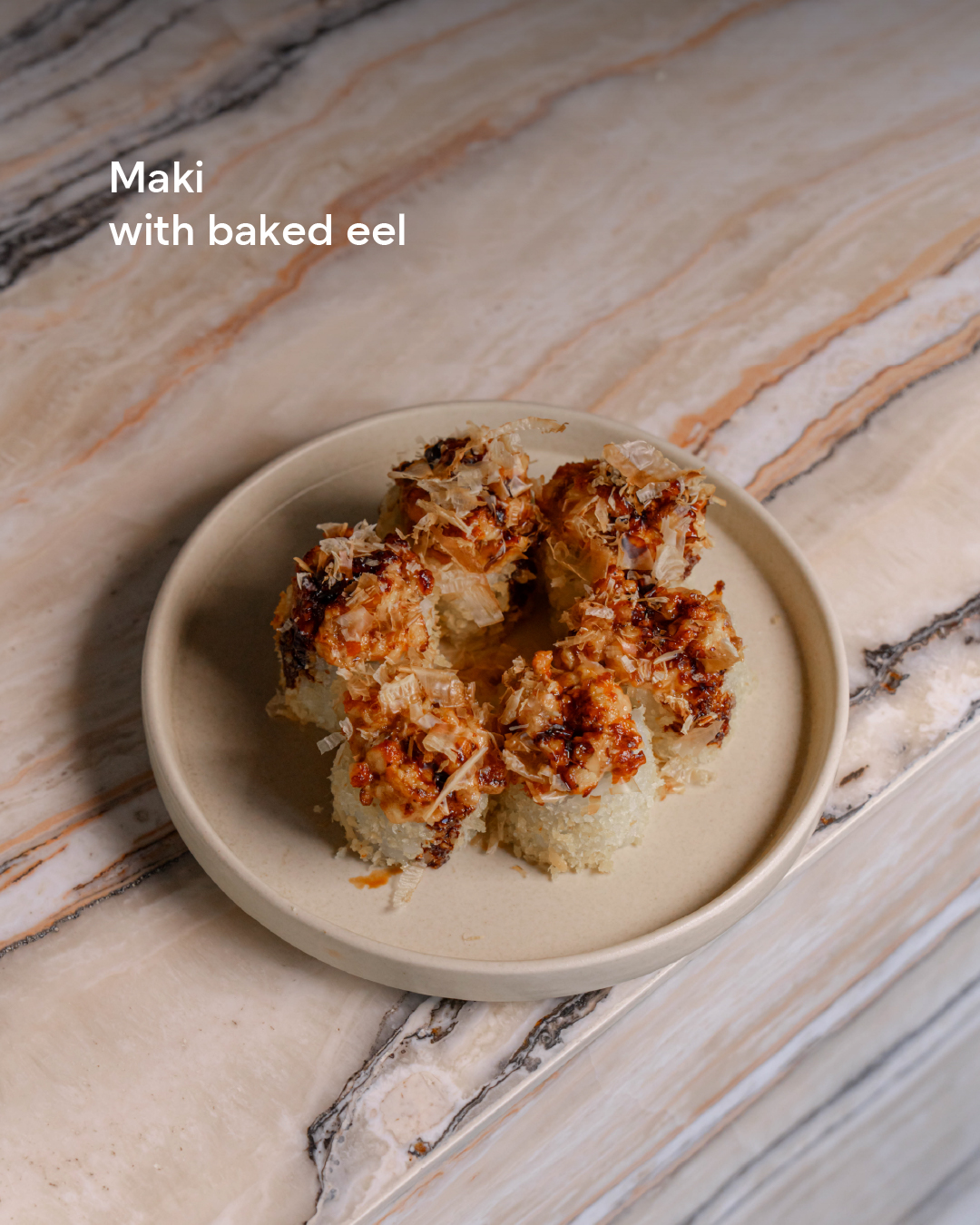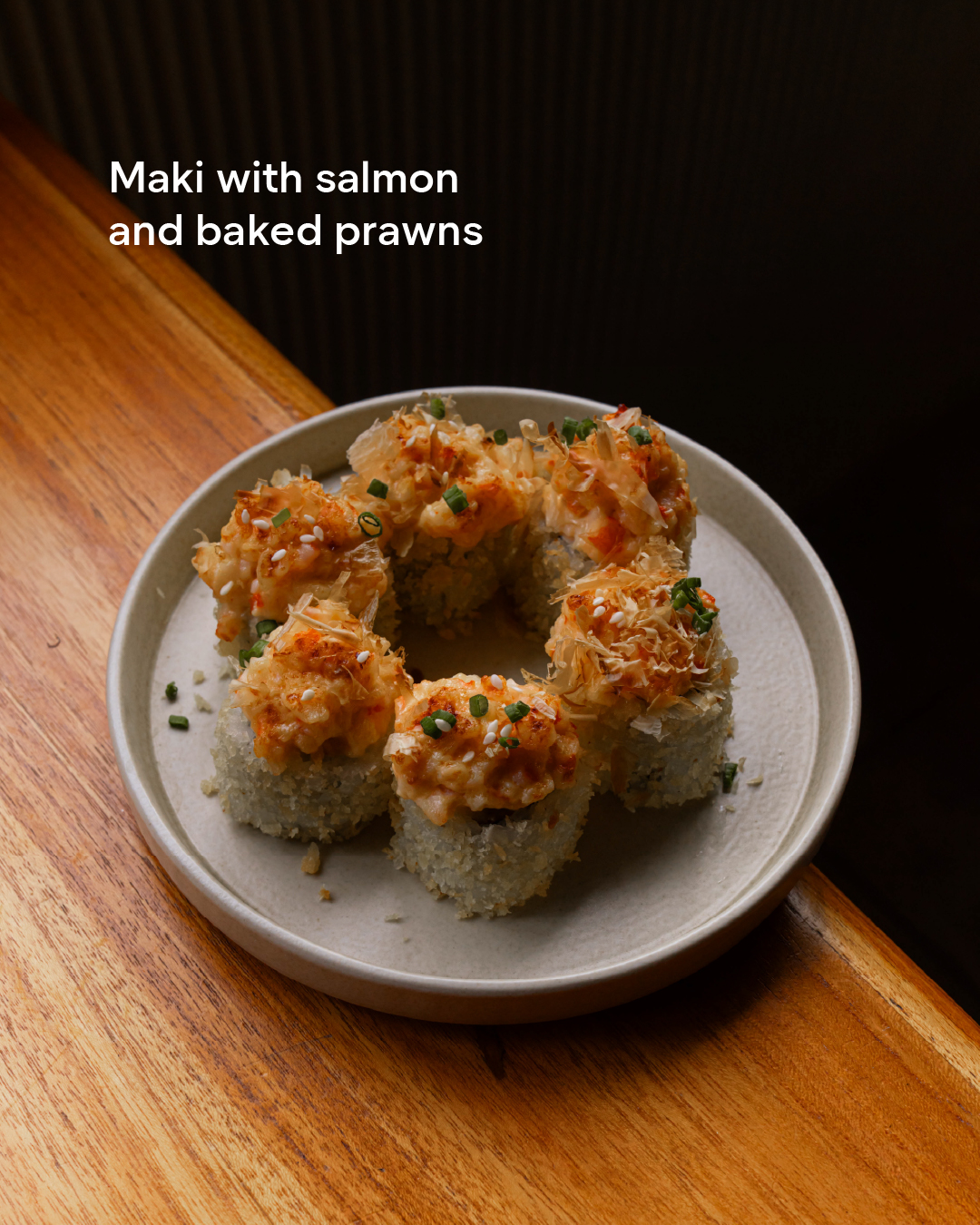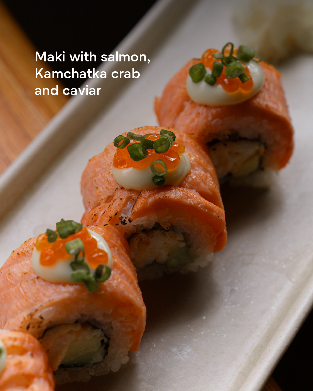 • Maki rolls with salmon, baked prawns, Kamchatka crab, caviar, or baked eel